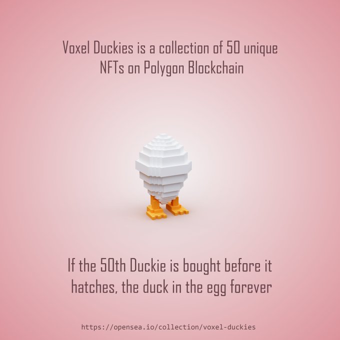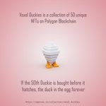 Voxel Duckies is a collection of 50 unique #NFTs on #Polygon Blockchain If the 50th Duck is bought before it hatches, the duck would be stay in the egg forever. #nftart #NFTCommunity #voxelart #opensea #voxelduckies #nftcollector #nft