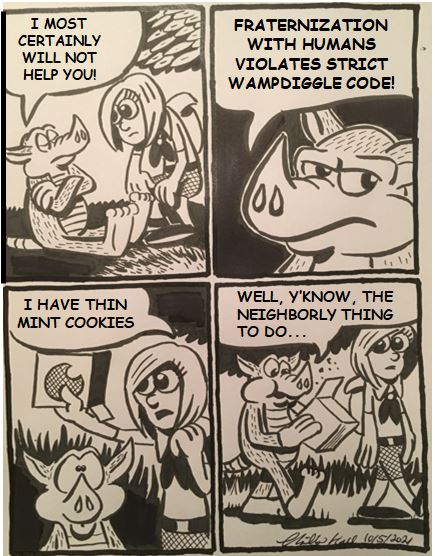 S1 E2.5 Like a pair of wispy #dandelion heads, the #Wampdiggle and Sally blew off into their journey. #vss365 #inktober2021 #inktober #comic #comicart #cartoonist