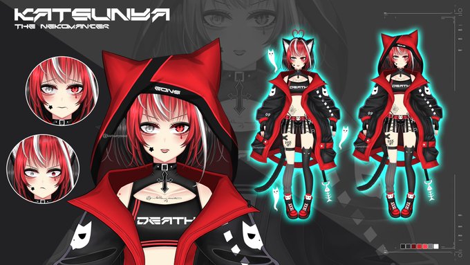 Hewo ~ ฅ ̳͒(◣ᆺ◢) ̳͒ฅ ~ I'm Katsunya, an edgy living dead cat girl who raise dead cats back to life 🥀🖤 Thanks to @EonsVX for helping me design this model ! It came out really good and I love it ~ #katsunyaaa #vtuber #VtuberEN #ENVtuber #vtubermodel #VtubersUprising
