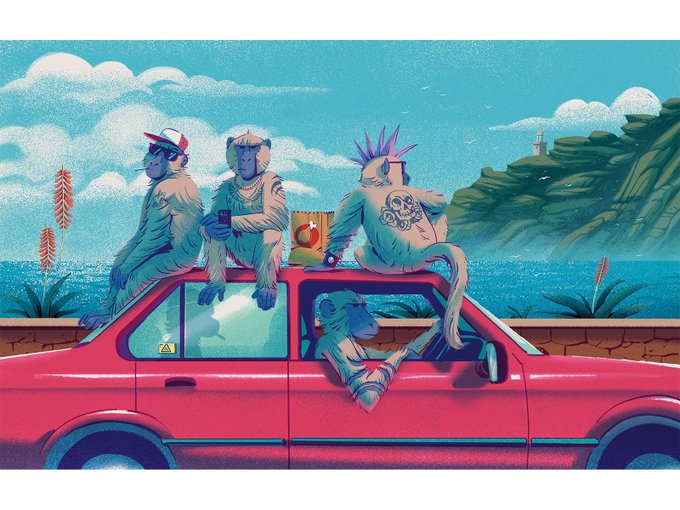 The Baboon Gang | Illustration commissioned by the @AkronArtMuseum. Exhibition open until 22 March at Artist Admin, Cape Town | Supported by @JackBlackBeer Project is now live! bit.ly/3XSm94g 🍺 #MUTI #illustration #digitalart #wacomart #artexhibition
