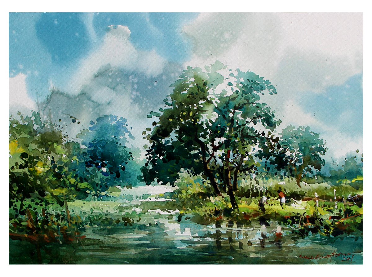 the song of summer sunset' by Shahanoor Mamun . [demo link] ▶️ youtu.be/1SbOXw1l0-A . watercolor painting size- #summerpainting #watercolorpainting #watercolordemo_shahanoormamun #watercolourdemonstration #shahanoormamun