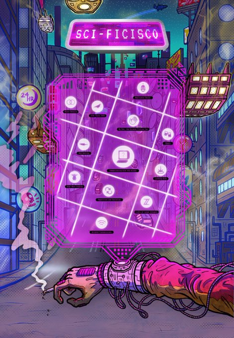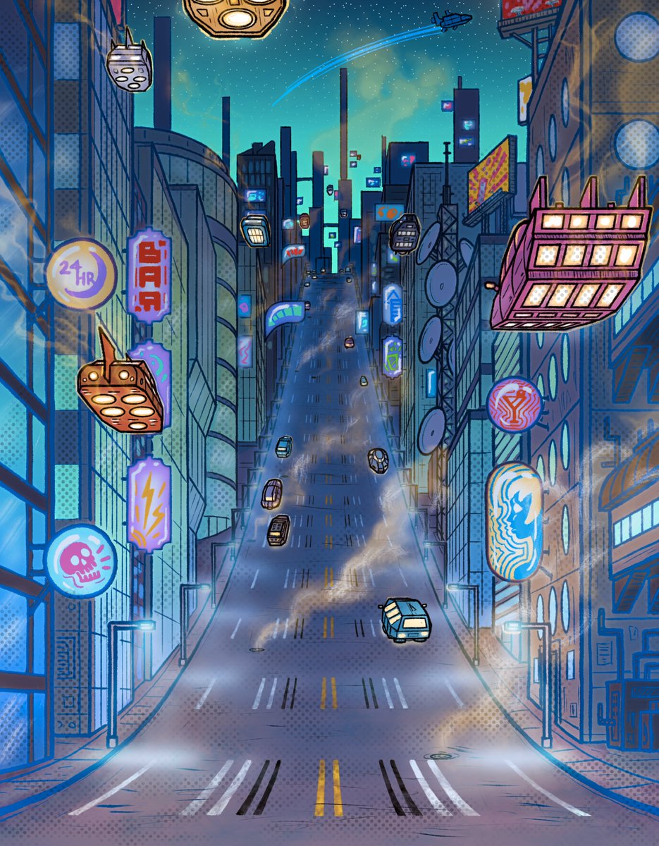 Here is the final image used in the hunt, with added map and wordmark designs by @jrladia. Image 2 is the standalone background illustration. (2/2) #MysteryHunt #illustration #digitalart #scifi #scifiart #cyberpunk #cyberpunkart #Werble #animatic #animation #graphicdesign