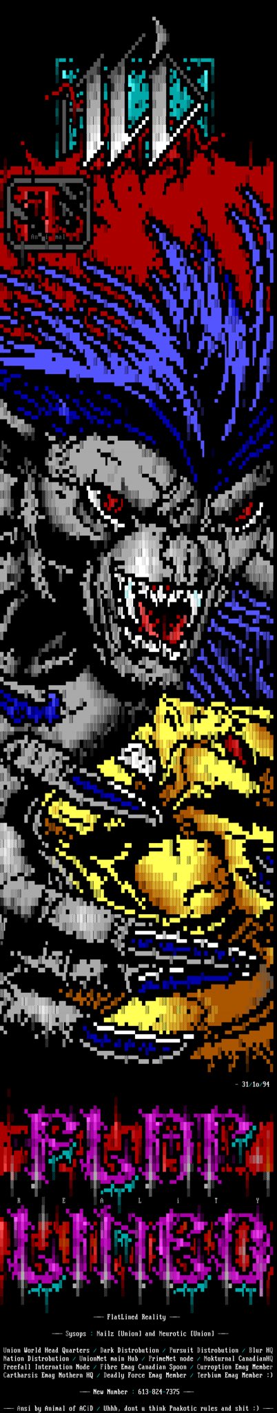 “Flatlined Reality” #Wetworks #ANSI by Animal // ACiD (1994) #ansiart #ascii #asciiart #pixelart #textmode #text #art #demoscene #bbs #retrocomputing #retrographics #8bit #8bitart #graffiti #graffitiart #imagecomics #image30thanniversary #comics #comicbookart #whilceportacio