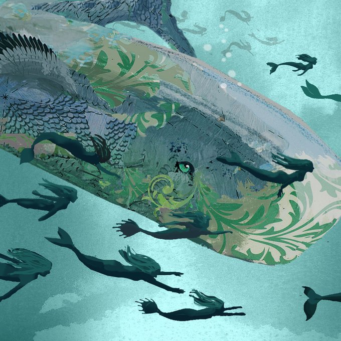 MERMAY Day 18 - Deep Sea. Rarely do mermaids travel in large groups, but once a year they gather together and dive deep into the endless depths of the ocean, to visit the oldest whale alive - the Grand Tattooed Whale #mermay2023 #whales #ocean #whalewatching #mermaids #tattooart