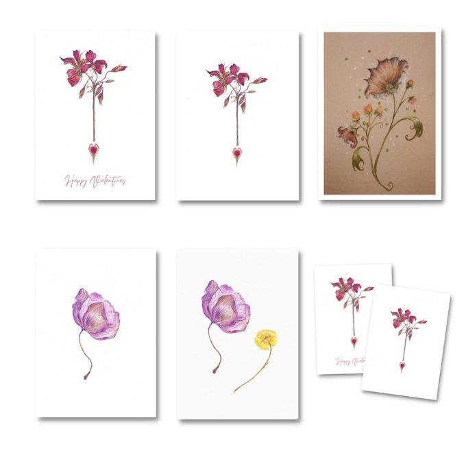 All the cards in my shops - inspired by my pressed flower collection, Valentines, and the Forlornly Hopeful arrival of Spring. #flowers #flowerart #floral #drawings #illustration #pencildrawing #pencilillustration #whimsy #whimsicalart #prettyflower #flower #artist #writer