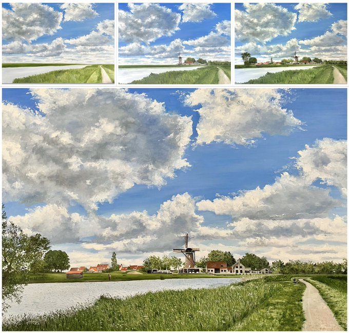 I put a few pictures together about the process of my painting “A walk along the creek” 🎨 I hope you like it 🙏😊 #landscape #sky #clouds #windmill #creek #Schoondijke #Zeeland #oilpainting #art #artistontwitter