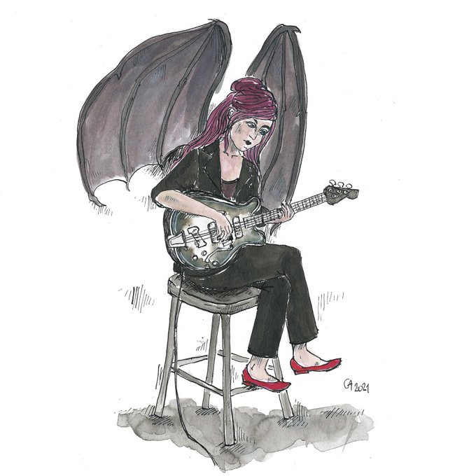 Jour 10: Pick et Winged Ma joueuse de guitare, un médiator à la main, avait des ailes de chauve-souris. #inktober2021 #inktober #inktober2021ga #pick #winged #mabsdrawlloweenclub #mabsdrawlloweenclub2021 #gabrielleaznardessine #guitariste