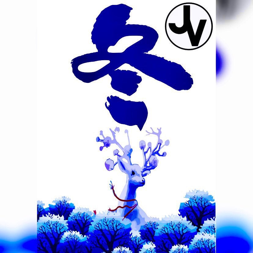 A bluish-white deer in centered position with a bunch of dark blue bushes along with a large kanji letter. #winter #winterday #winterdays #winterseason #winter2023 #art #artist #artwork #digital #digitalart #digitalartwork #illustration #illustrator #photoshop