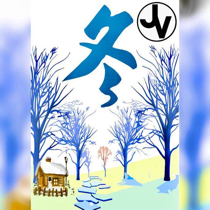 A landscape with a bunch of bluish-white trees covered with snow along with a single kanji letter. #winter #winterday #winterdays #winterseason #winter2022 #art #artist #artwork #digital #digitalart #digitalartwork #illustration #illustrator #photoshop