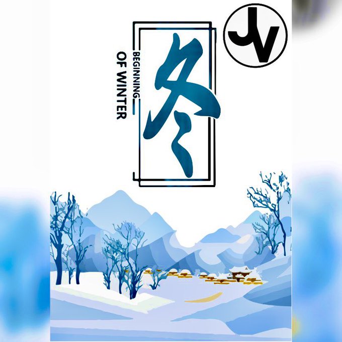A light blue landscape shows small houses covered in snow with crooked trees, mountains and a single kanji letter on a double-sided border in a centered position. #winter #winterday #winterdays #winterseason #winter2023 #art #artist #artwork #digital #digitalart #digitalartwork