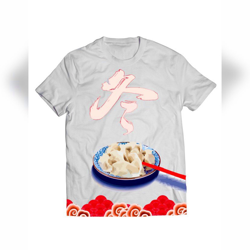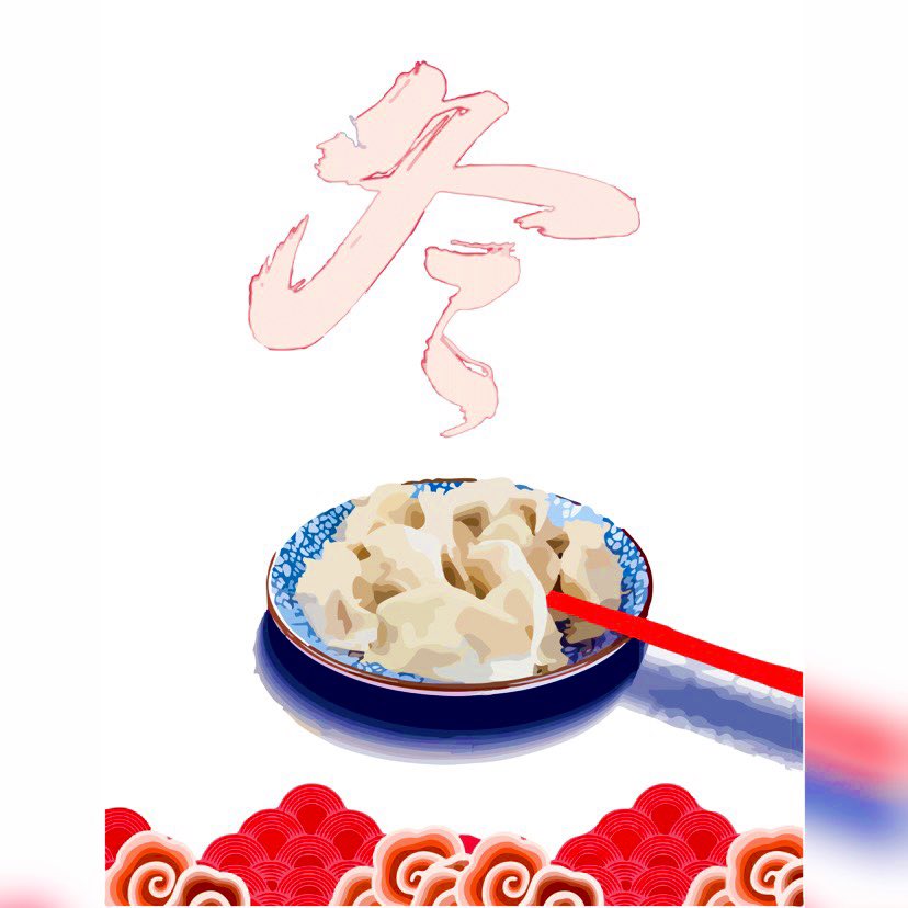 A small blue plate filled with dumplings and red chopsticks stacked on the side along with a light grayish red kanji letter. #winter #winterday #winterdays #winterseason #winter2023 #art #artist #artwork #digital #digitalart #digitalartwork #illustration #illustrator #photoshop
