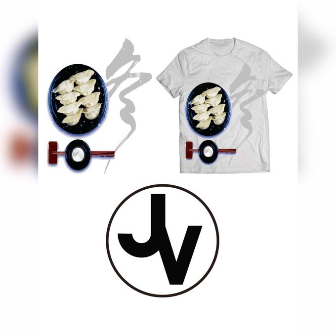 The round shape of a yellowish orange dish stuffed with dumplings along with soy sauce and a pair of chopsticks; it includes a kanji letter on the right side of a border. #winter #winterday #winterdays #winterseason #winter2023 #art #artist #artwork #digital #digitalart