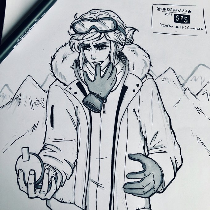 Day 16: Compass 🖊#inktober2021 🖊 Thank you to my fiancé who posed for me. The expression was a tedious one! Check out @SilverportSPS for additional context soon! ⭐️ #winterjacket #coldday #webcomic #webtoon #compass #adventure #story #goggles #winterfashion #mensfashion