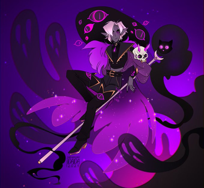 witch time is never over👁️ look at this edgy boy 💜🖤 and his blep cat familiar #ArtistOnTwitter #characterdesign #characterart #witchtober2021 #witch #halloween2021
