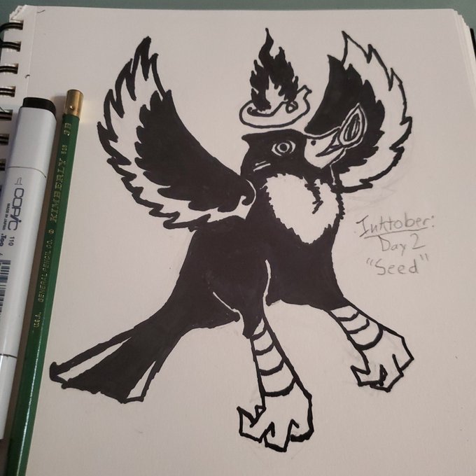 Inktober day 2: "seed" Who likes sunflower seed more that a sparrow/finch/cardinal amalgam with a crown of flames? #inktober2022 #witchtober2022 #witchtober_pob