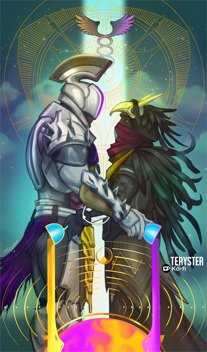 My second card for the @Destiny2Tarot project, Two of Chalices! The full deck of tarot cards is free to download now! Enjoy! #AOTW #DestinyArt #DestinyTheGame #Destiny2Tarot #gaming #fanart #o14 #osiris #saint14 #tarot #witchtwt