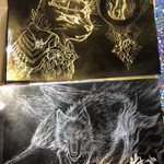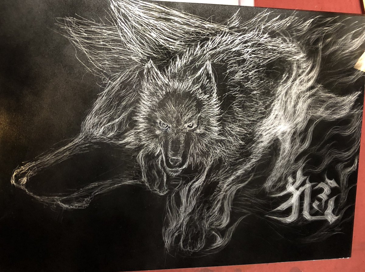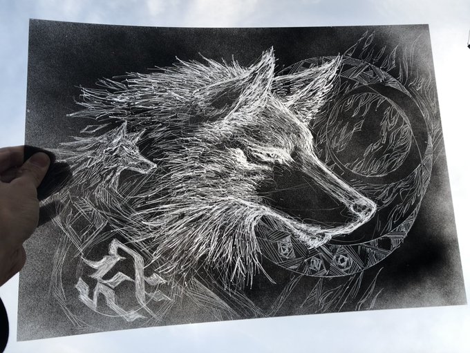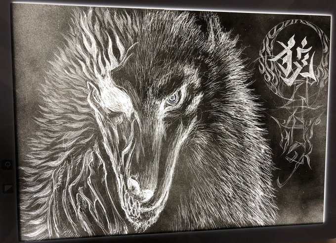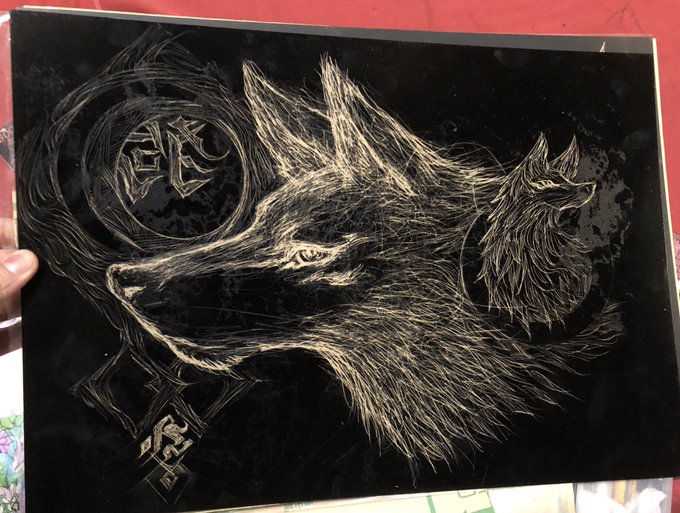 アクリル板をカッターナイフで削って描く #スクラッチアート 狗の字は梵字ぽくアレンジしつつ鏡文字 全面下描きなしの一発描き #wolf #wolfdog #狼 #冬の創作クラスタフォロー祭り #絵描きさんと繋がりたい #PortfolioDay #artoftheday #ArtistOnTwitter