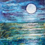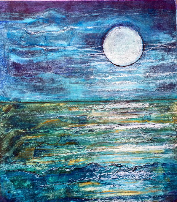 Look at the beautiful Wolf Moon tonight it is glowing bright in the sky just like my collagraph print #WolfMoon #moonlight #FullMoon #seaside #reflections #print #ArtistOnTwitter #art #artwork #collage