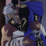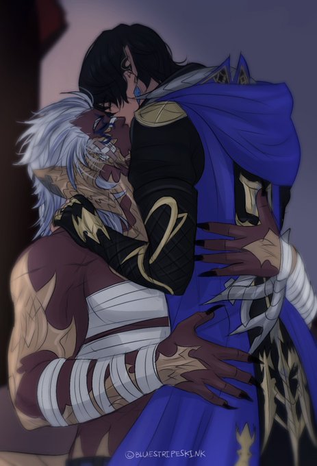 first kiss 💙✨ day 2 of #wolmericweek! o'ivur wanted to thank aymeric for the lovely dinner he prepared for him, but even standing on his tippy toes he couldn't reach 🥹 luckily, aymeric rewarded him for his efforts with a real kiss after 💕 #wolmericweek2023 #ffxiv #ffxivart