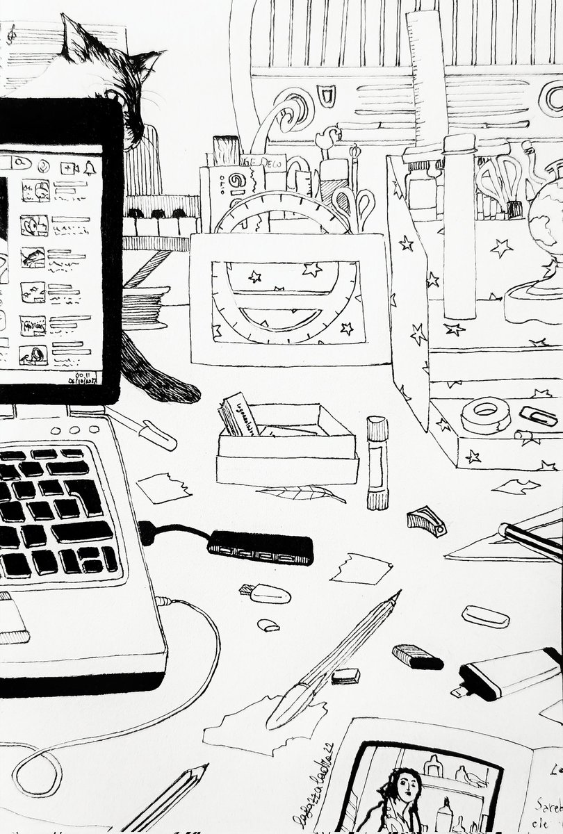 #strangelandinktober day 5 - my #workplace . (a sto giro sono stata sfigata perché avevo appena finito di smontarlo per l'ennesimo trasloco :^) . {list by @nicozbalboa} . . . #inktober2022 #inktober #graphicjournaling #sketch #portrait #desk