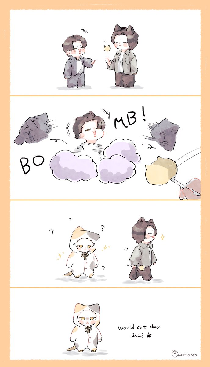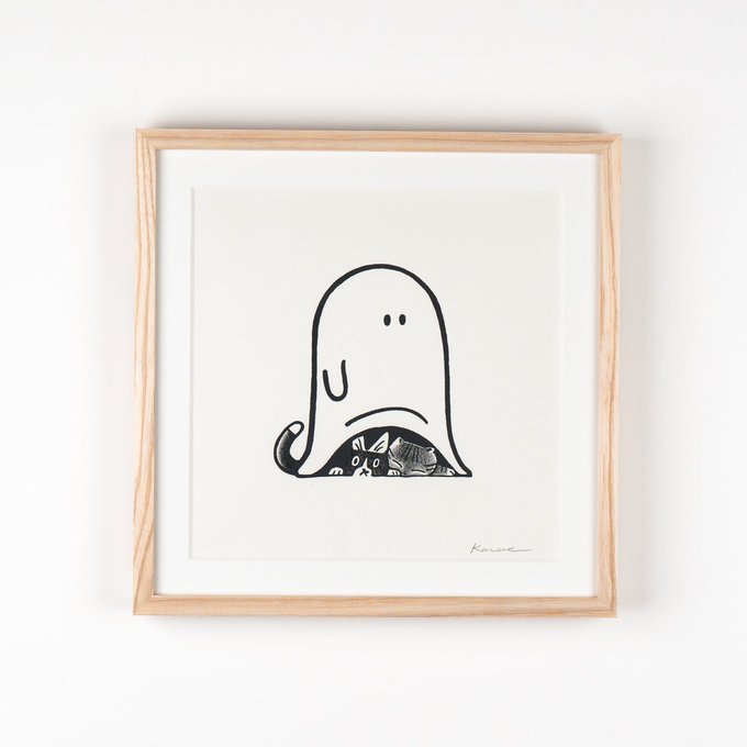 『チェック済みのおばけ』 念入りにチェックされたのち、安心安全のお墨付きをもらったおばけです。 (過去作『チェックされるおばけ』の連作です。) 今日は #世界猫の日 #WorldCatDay という事で、猫がいる作品をご紹介😊 おばけの中でまったりする2匹は我が家の猫たちをモデルにしました🐈🐈⬛ twitter.com/magishikana/st…