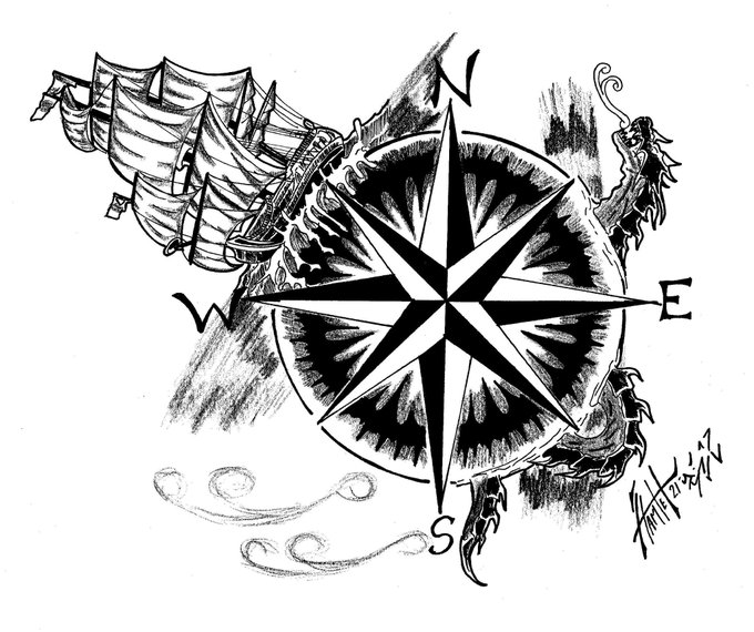 Inktober 2021, #16, Compass Esos lindos indicadores en mapas antiguos y de fantasía, que incluyen bestias marítimas, sirenas y barcos. #inktober #inktober2021 #inktobercompass #deviantart #xolotlrex