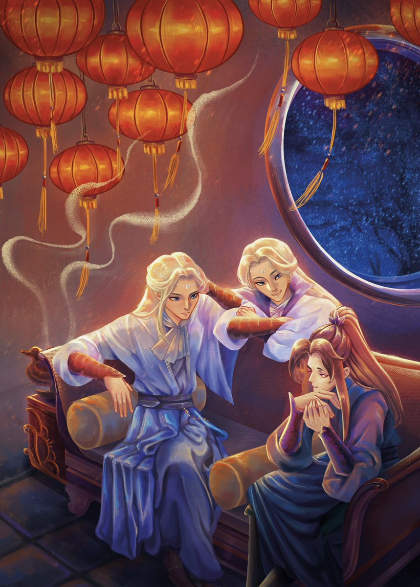 Part 3/3 🌸 Brothers and Xue Meng celebrating Chinese New Year 🧧 Artwork for @newyearzine ✨ #二哈和他的白猫师尊 #2ha #erha #meihanxue #xuemeng