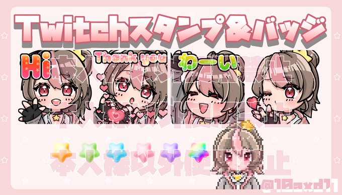こちらご依頼で描かせていただきました! 色合いとっても好みで、バッジも飴ちゃんみたいな星もちーふも可愛くて描いてて楽しかったです✨ 素敵なご依頼ありがとうございました! #Twitchスタンプ #Twitchバッジ #yanebadot #有償依頼
