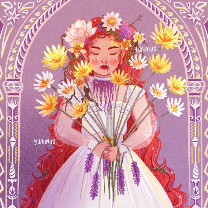 ⚠️TW w0und, bl00d ⚠️ 3rd week of #producember22 challenge - flower queen 👸🏽💐 My persona, Nyan, as a flower queen with Daffodils, Water Lilies & Astragalus flowers around her. 🤍💛💜 #oc #illustration #artchallenge #characterillustration #procreateart #yanimyoo