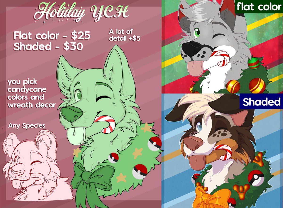 Holiday YCH ❄️Flat Color - $25 ❄️Shaded - $30 (A lot of extra details will be +5) ❄️You pick wreath theme and candy cane flavor/color! Any species! ✨RTs and Comments are super appreciated! #ych #furry #furryart #furryych #artcommission #commissions #ychforsale