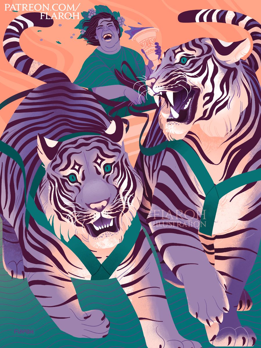 Dionysus and his tiger-drawn chariot 🍇🐅🎉 This illo was my Jan 2022 New Year illustration! It's an homage to the #YearOfTheTiger, using Pantone's colour of 2022, "Very Peri" 💜 Only 3 days till we say goodbye 🐯!