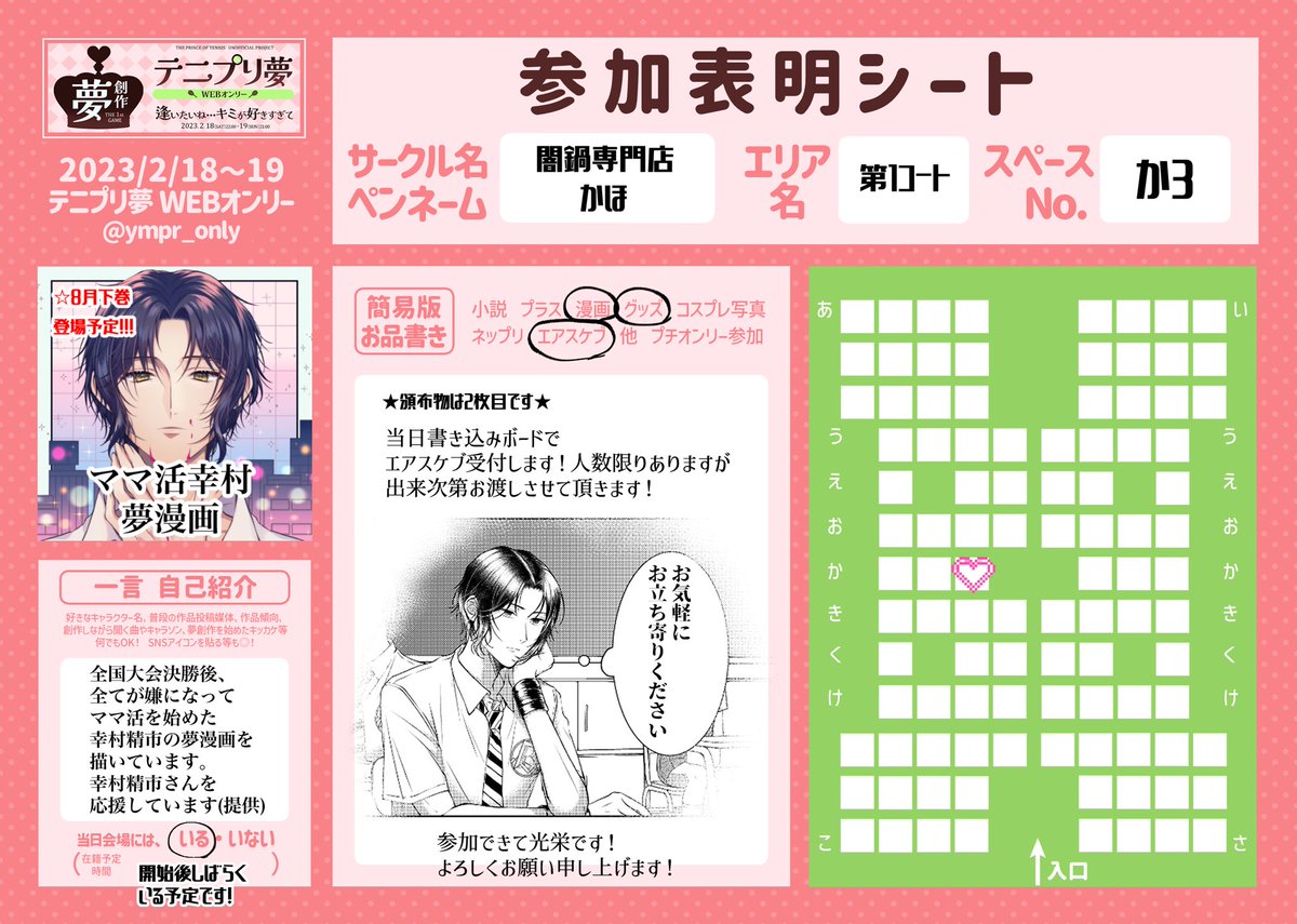 2023年2月18〜19日開催 夢プリwebオンリーに参加します💕💕 サークル:闇鍋専門店 スペース:第1コート か3 続編は8月発行予定です❣️エアスケブも受付しますのでよろしければお気軽にお立ち寄りください🥰 (3枚目シマエナガちゃんのアバターでいます❣️) #ymprオンリー #ymprオンリーお品書き