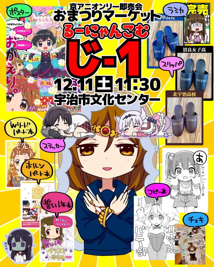 12/11(土)宇治文化センターにて開催のようこそフェスティバル内の京アニオンリー「おまつりマーケット」参加致します!🐰 るーにゃんこむ【じ-1】新作グッズやらコピー本あるのですが告知間に合わないのでダイジェスト版にて! 詳しくは後日!!!宇治でお会いしましょう!!!!!!! #youkosofes