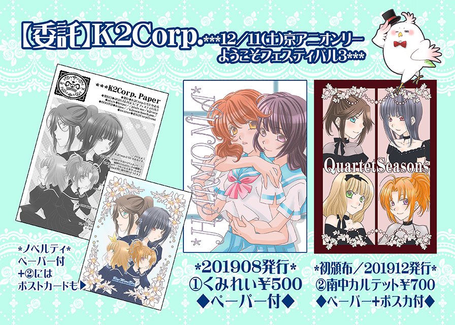 【お品書】 12/11(土)京アニオンリーイベント「ようこそフェス3」に委託参加します ①くみれい百合「HARMONIA」 ②南中カルテット総集編「QuartetSeasons」★初頒布 ◆封入ノベルティ◆ ①②共通ペーパー ②南中総集編は更にポストカード付 当日はお世話になります。宜しくどうぞ♪ #youkosofes twitter.com/K2Corp/status/…