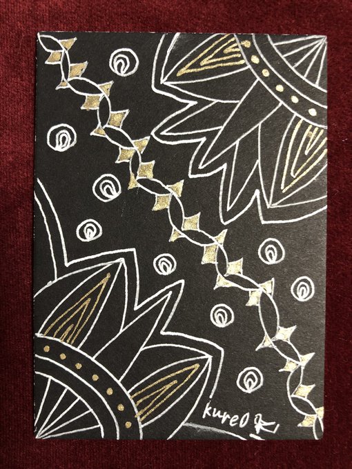 黒いATCカードに差し色金で、ちょっと古代エジプト風な雰囲気にしたくてロータスっぽいのも描いてみた。 #zentangle #ゼンタングル #zentangleinspiredart #ゼンタングルインスパイアドアート