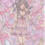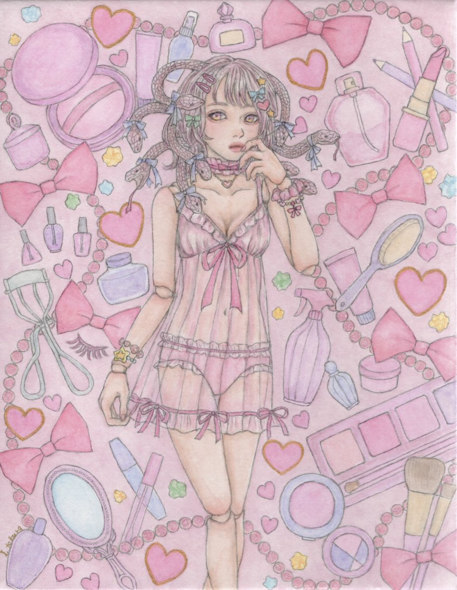 #ZEROTEN2022 東京 出展作品 「可愛くなりたい。」 透明水彩、絵墨、アクリルガッシュ、イリデッセントメディウム、アルシュ水彩紙、木製パネル 2022 人から恐れられるメデューサの「可愛くなりたい」という気持ちをゆめかわいいをモチーフに描きました。
