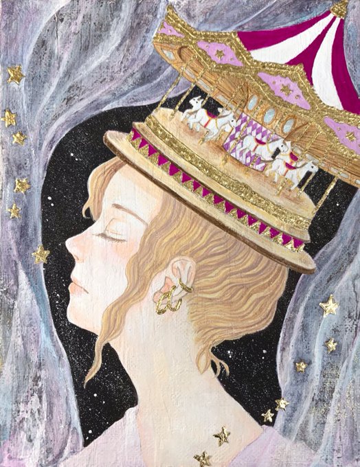 【作品解説】 「回転木馬症候群」 現実逃避としての空想、思考がぐるぐるして無限ループから抜け出せない様を描いてます。 構想自体は数年前からあって、やっとかたちにしました。箔貼るのが楽しかったです。ぷっくりしてます。あと思ってたよりかわいくできました。 #ZEROTEN2022 #art #イラスト twitter.com/rurimatsuri7…