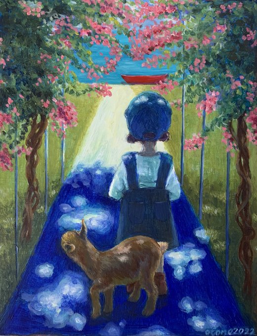 『赤い小舟』 ブーゲンビリアのアーチでできた陰の中から見える、眩しい世界。赤い小舟を見ている女の子の背中。 女の子の表情や感情は観る人に委ねたいという想いで描きました。 初夏の展示なので、大好きなブーゲンビリアと夏の光がテーマです。 #ZEROTEN2022 #東京 t2y.info/artist01/14780…