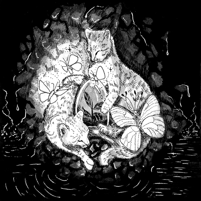 День 20: sprout/росток Древние коты-хранители подрастающего жизнедрева. 🥺 Одни из ключевых фигур древних кошко-сказаний (котоцивилизация в моей голове всё больше обрастает лором xD) #Inktober #inktober2021 #котябрь