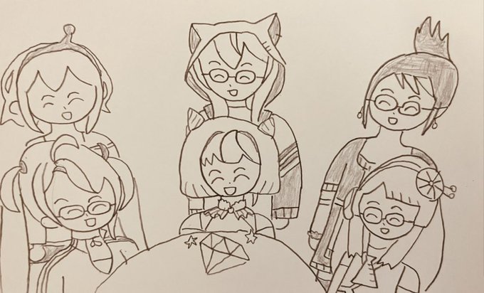 【かに座のラッキーアイテム】ダイアモンドを見るウェザーロイドちゃんと、白海クリオちゃんと、花畑チャイカさんと、水瀬しあちゃんと、アズマリムちゃんと、天野ピカミィちゃん #ウェザロアート #クリオ絵 #お花畑青空大写生大会 #しあーと #リム絵 #azulimart #pikart