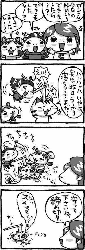 日テレのミスデビルを見て、ウチのカネコを思い出すというご意見を複数いただいたので、古いマンガを発掘してきました。こういうことかしら? #BONteっていう季刊本の巻末で載せていたスタッフ紹介マンガです #今見るとヒドい表現ね