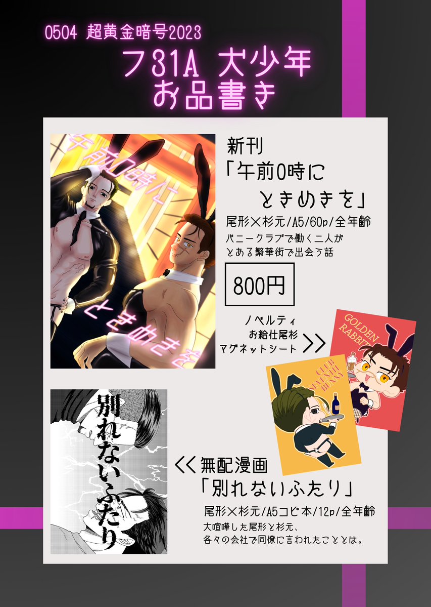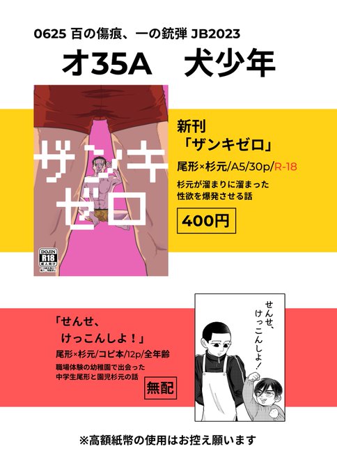 5/4 超黄金暗号2023 尾杉プチ フ31a 犬少年 お品書き 無配は間に合えばあります!(当日机上にあるお品書きには載ってないですすみません) 当日は友人に売り子をお願いしています、本人は買い物終了次第スペース戻ります🙇♂️よろしくお願いします! 新刊サンプルはツリーにて #百の傷痕一の銃弾4