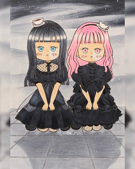 今日は黒の日(9/6)なので、黒一色のゴスロリ衣装の百葉(右)&葉純(左)を💖 カップ付カチューシャは声優の豊崎愛生さんのお写真を参考にさせて頂きました🙏🏻✨ C-3とC-5がカスカスに笑笑笑 #絵描きさんと繋がりたい #イラスト好きと繋がりたい #イラスト #illustration #みんなで楽しむTwitter展覧会