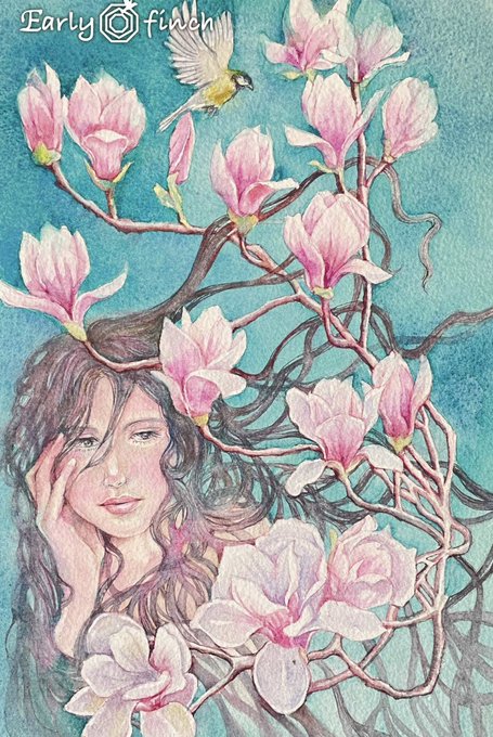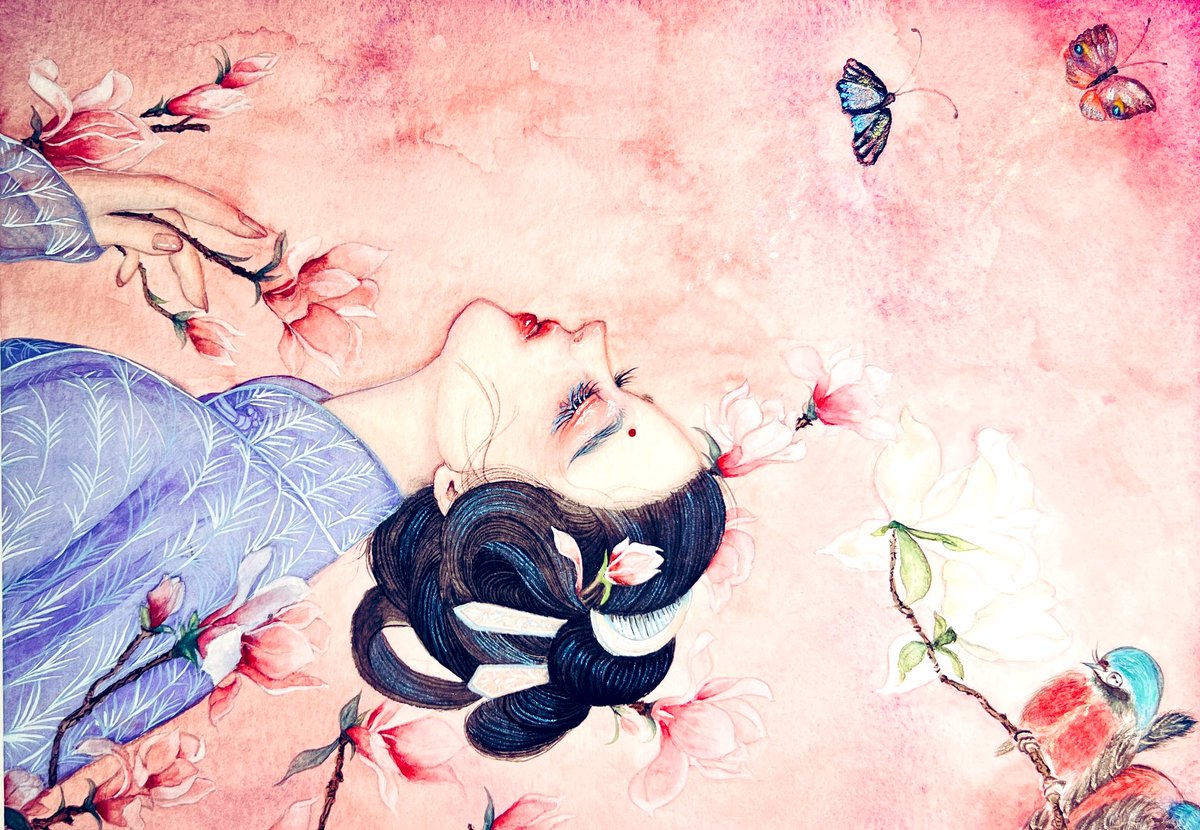 宿題の練習 《三月辛夷花開》 雲鬢,春衫,鳥蝶中沐春 Hahnemühle30x40cm粗紋/Holbein四季新古彩 墨運堂顏彩金屬色 #painting #watercolor #illustration #絵 #落書き #絵描きさんと繋がりたい #イラスト好きさんと繋がりたい #絵師さんと繋がりたい #イラスト