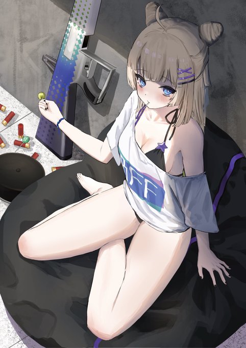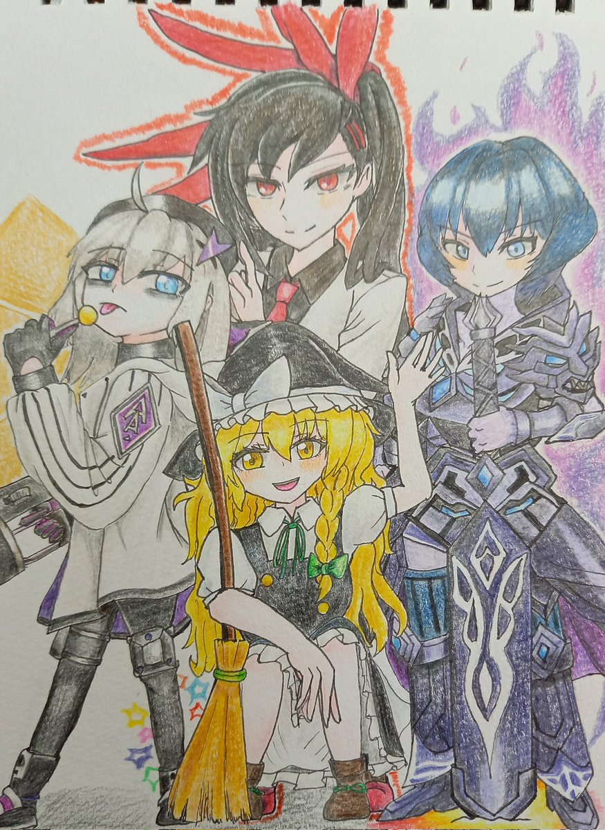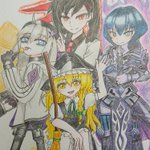 #同じ声優でキャラ晒せ #アナログイラスト CV:本多真梨子 左:AA-12(ドールズフロントライン) 上:ユリ・ザハード(神之塔) 下:霧雨魔理沙(東方ダンマクカグラ) 右:愛染明王(モンスターストライク)