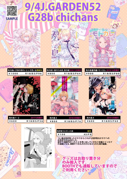 #J庭52 最終告知とします。新しいものは ・免許取りに行った話¥100 ・名刺 無料 J庭初売りが ・死の島6¥1000(ネタバレペーパーお付けします) となっております。 変な本ばっか作ってるなサークルchichans…配置はG28bです! #COMITIA141