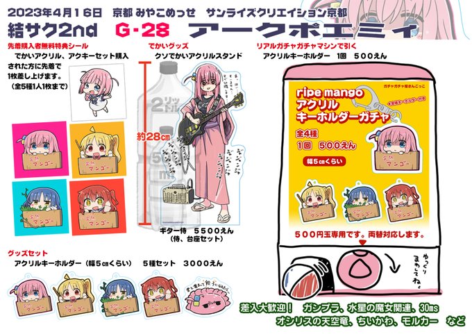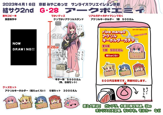 本日4月16日の京都みやこめっせ、サンライズクリエイション京都2023春に参加します。 ガチャガチャ背負っていきますのでよかったら回しに来てください。 先着特典でシールあります。 アークポエミィ 結サク2nd SP-No.G-28 sunrise-kyoto.tumblr.com