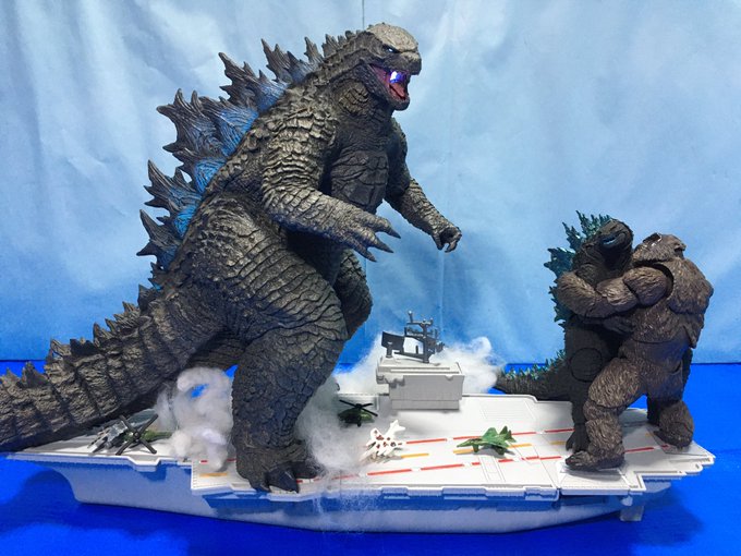 #夜のフィギュア撮影会 5/24 お題 『敵対』 「ゴジラは敵じゃない!あっちが敵!」 少女ジアの懸命の訴えに心動かされ、長年敵対してきたゴジラとの共闘を決意したコングではあるものの、今度の敵、メカゴジラは余りにも強大過ぎた。#Godzilla2021 #Kong2021 #MechaGodzilla2021 #SHMonsterArts