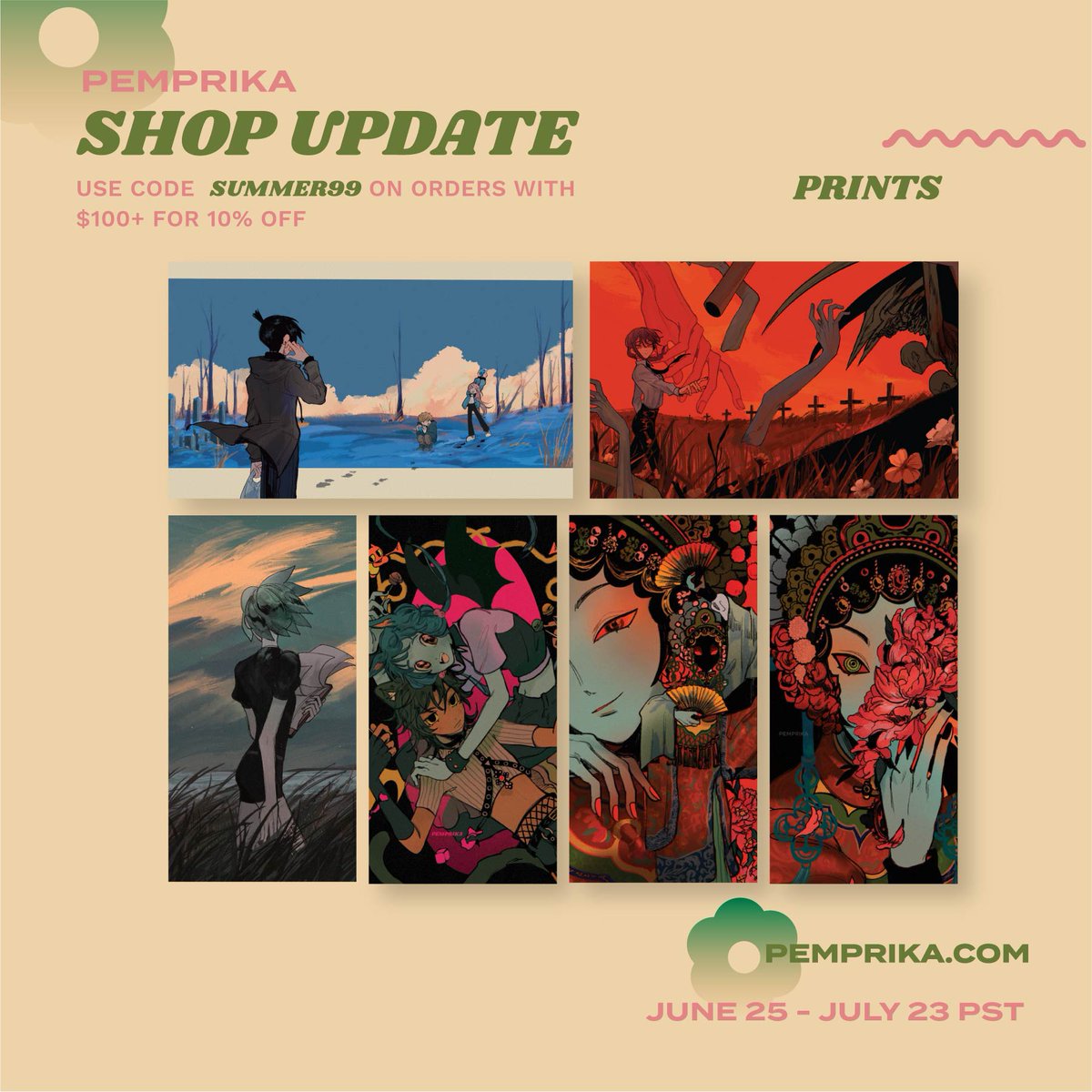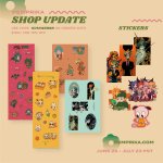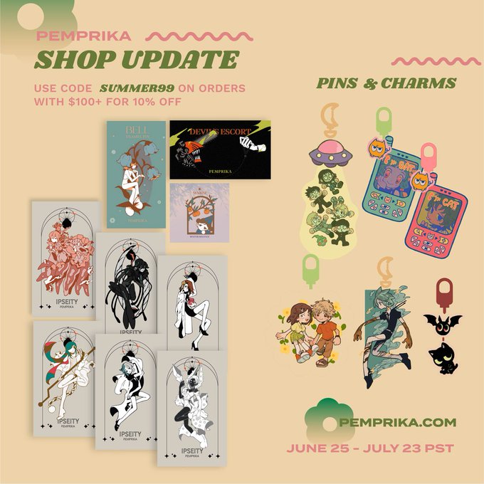 shop update!! 🫨 some preorders, restocks, and new adds, including pins, stickers, charms, prints, and notebooks 🕺 shop is open from june 25 to july 23 PST! 🥳📣 🍎pemprika.com🍎