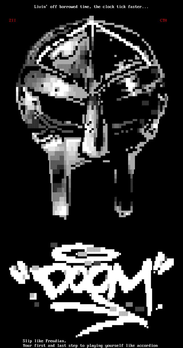 “RIP MF DOOM” ANSI by Cthulu & @Zeus_II // @mistfunk (2021) 16colo.rs/pack/mist1021 #ansiart #ansi #ascii #asciiart #pixelart #textmode #textart #text #art #demoscene #bbs #retrocomputing #retrographics #8bit #8bitart #typography #graffiti #graffitiart #mfdoom